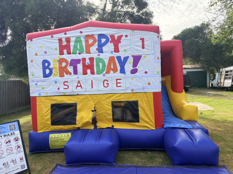 Make your party extra special with our Personalised Party Combo jumping castle! This colourful combo castle features a bouncing area with slide, making it perfect for birthdays and celebrations of all kinds.